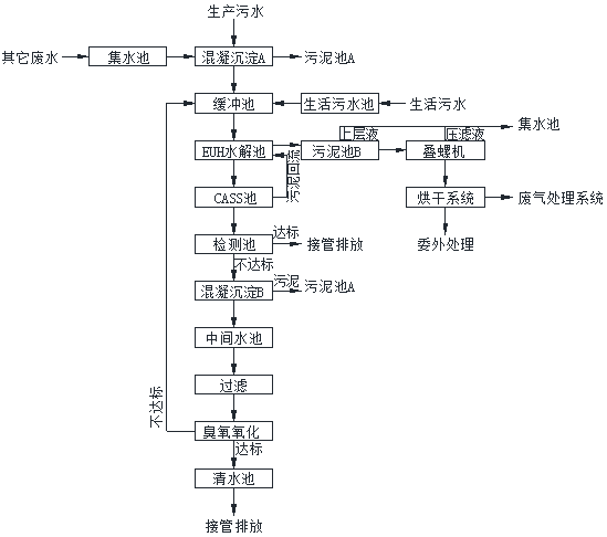 混凝沉淀A/B、水解池產生的污泥,進入污泥濃縮池經壓濾機進行脫水,脫水后的污泥委外處理,水進入調節池。