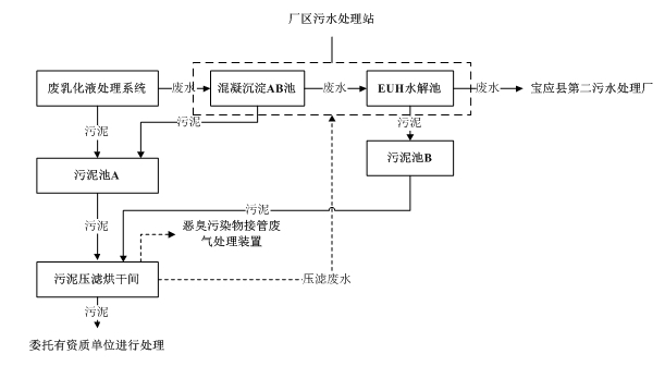項目產生的生產工藝廢水、軟水制備棄水、廢氣處理廢水、生活污水、初期雨水收集后進入廠內自建污水處理站(具體見上述描述的處理工藝),處理達到寶應縣第二污水處理廠接管要求后接入污水處理廠進行深度處理.