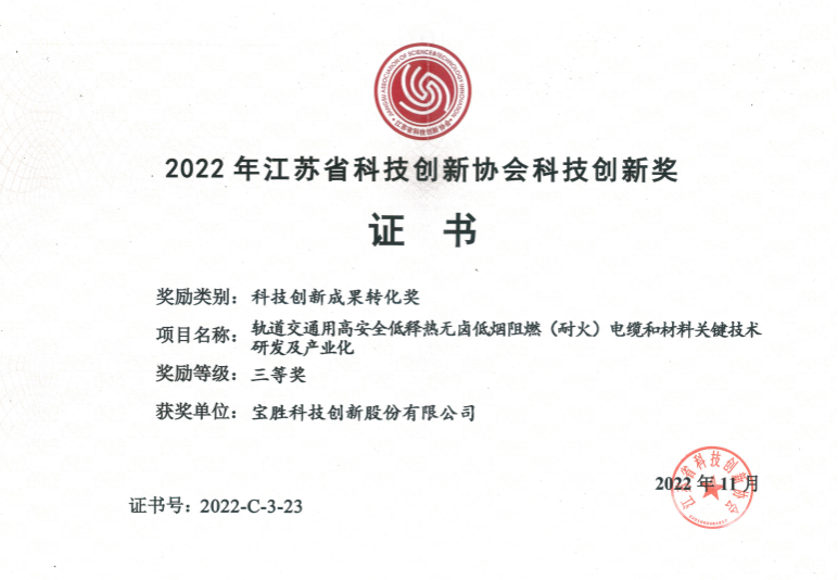 近日,2022年度江蘇省科技創新協會科技創新獎獲獎名單公布,寶勝科技創新股份有限公司“軌道交通用高安全低釋熱無鹵低煙阻燃(耐火)電纜和材料關鍵技術研發及產業化”項目榮獲科技創新成果轉化獎三等獎。