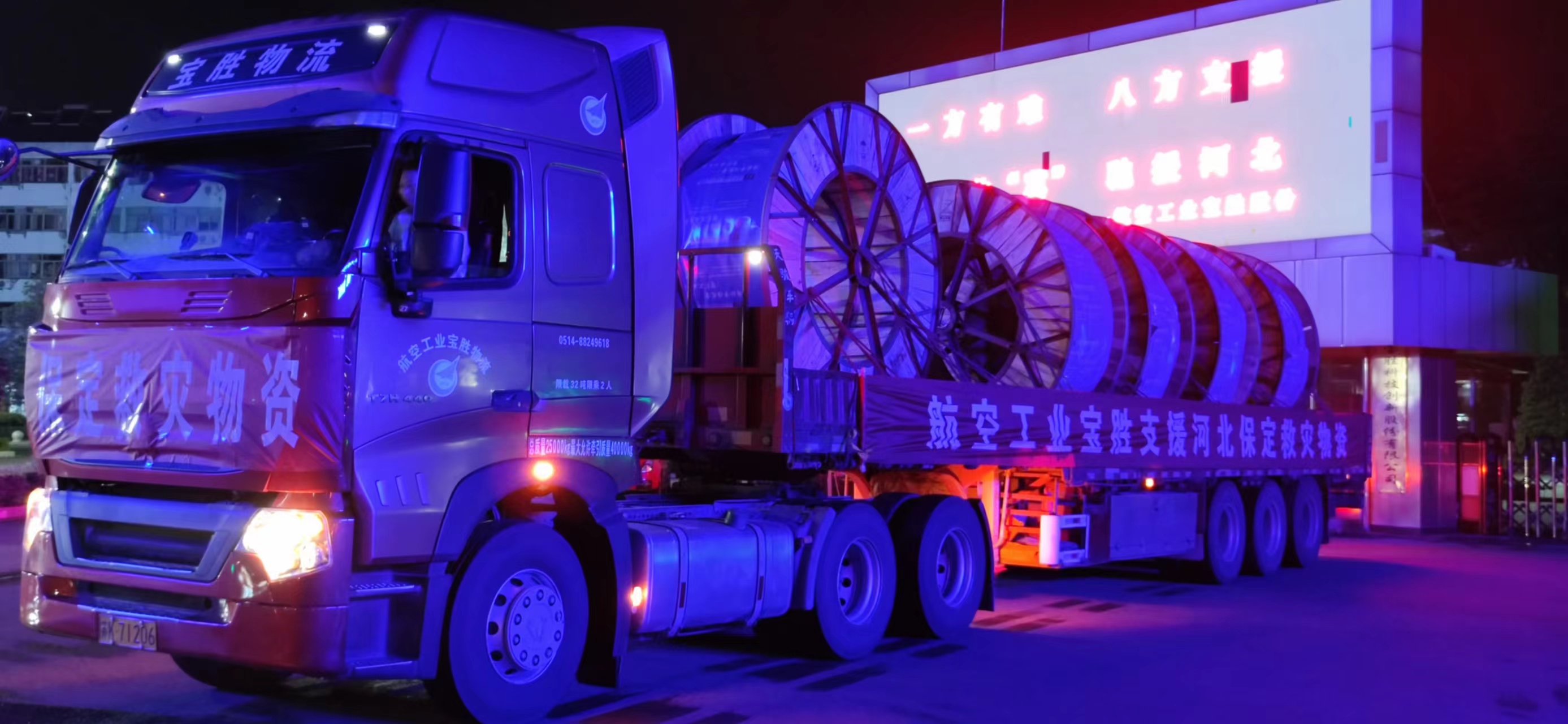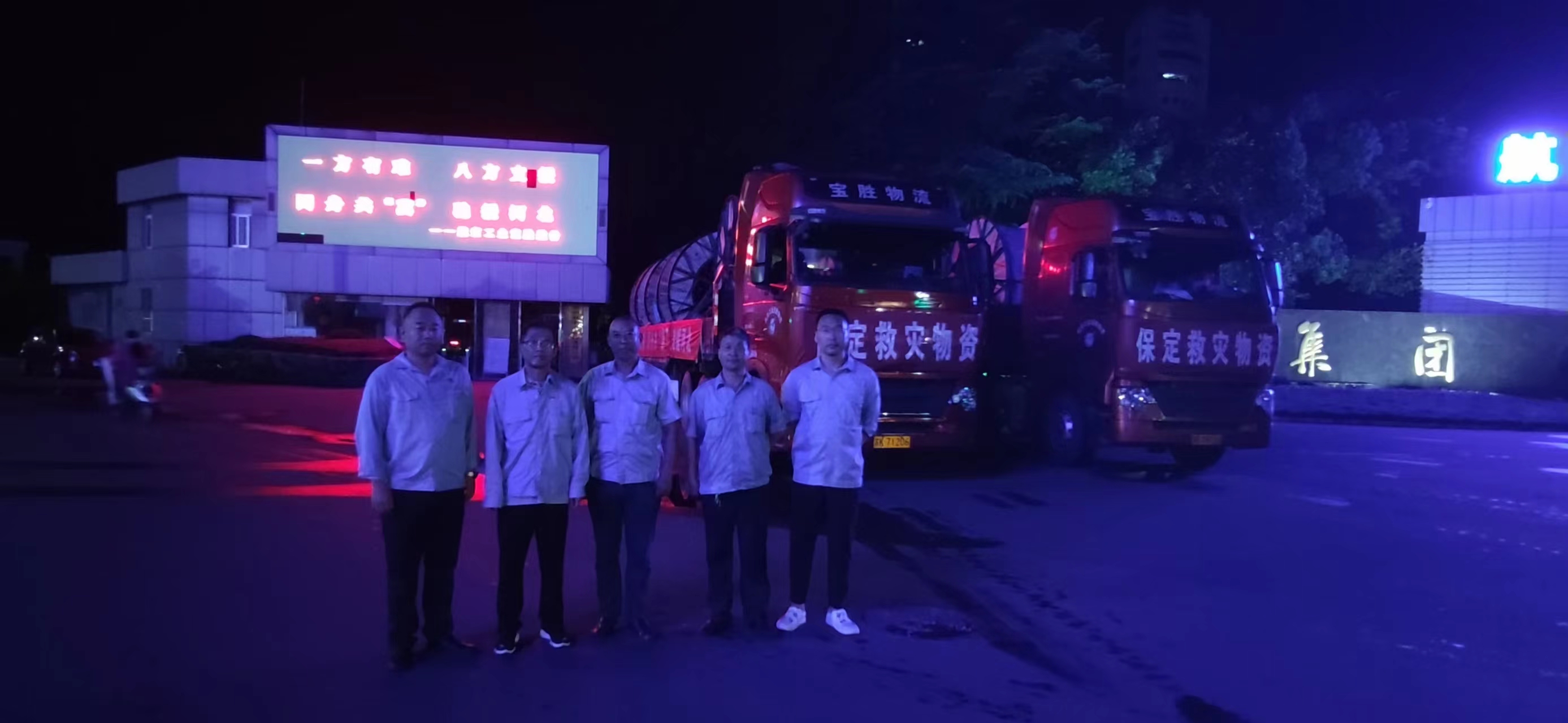 8月6日晚8時(shí)20分,兩輛滿載電纜物資的卡車駛出寶勝股份廠區(qū)奔向河北保定,支援電力應(yīng)急搶修。