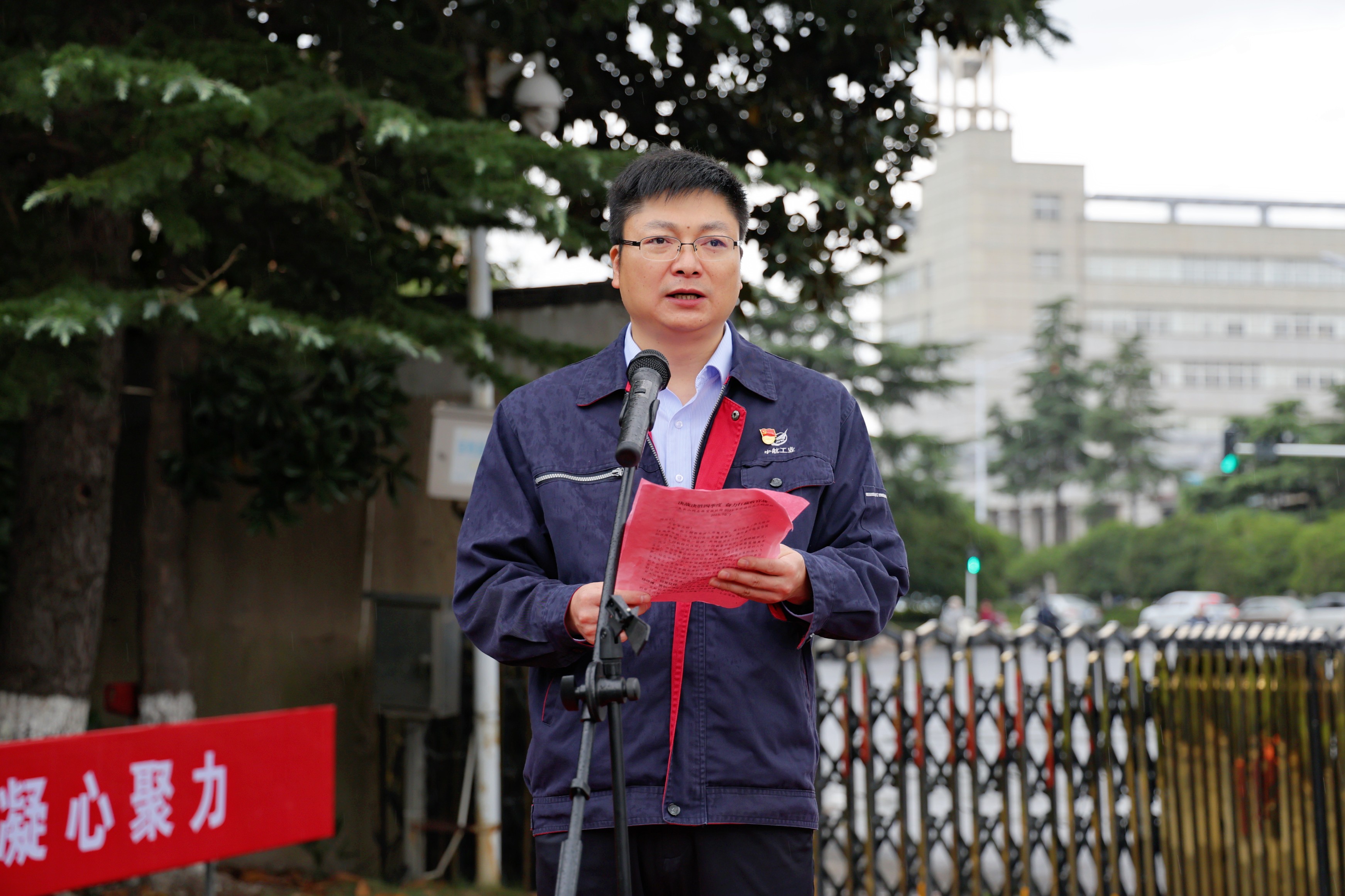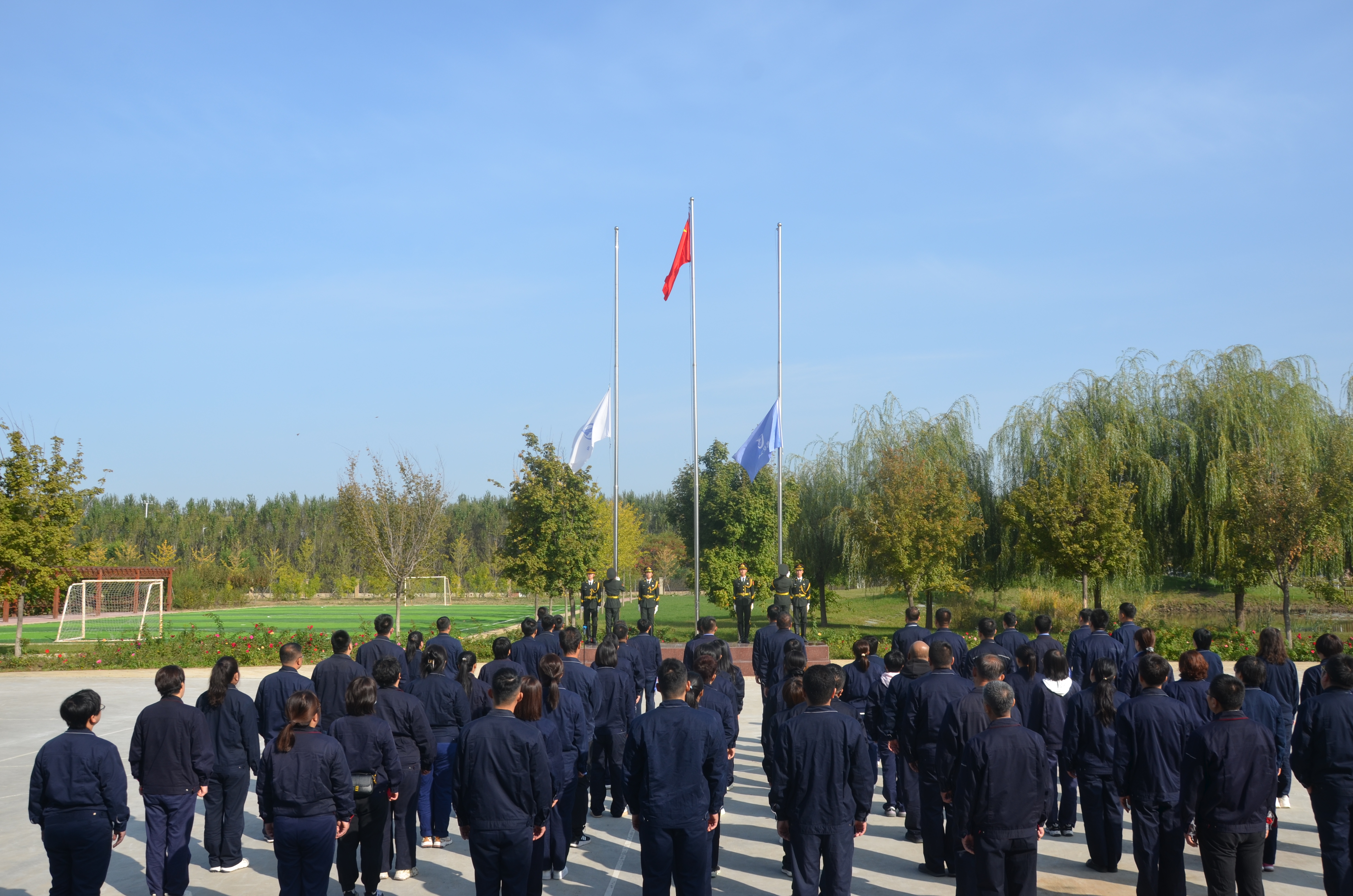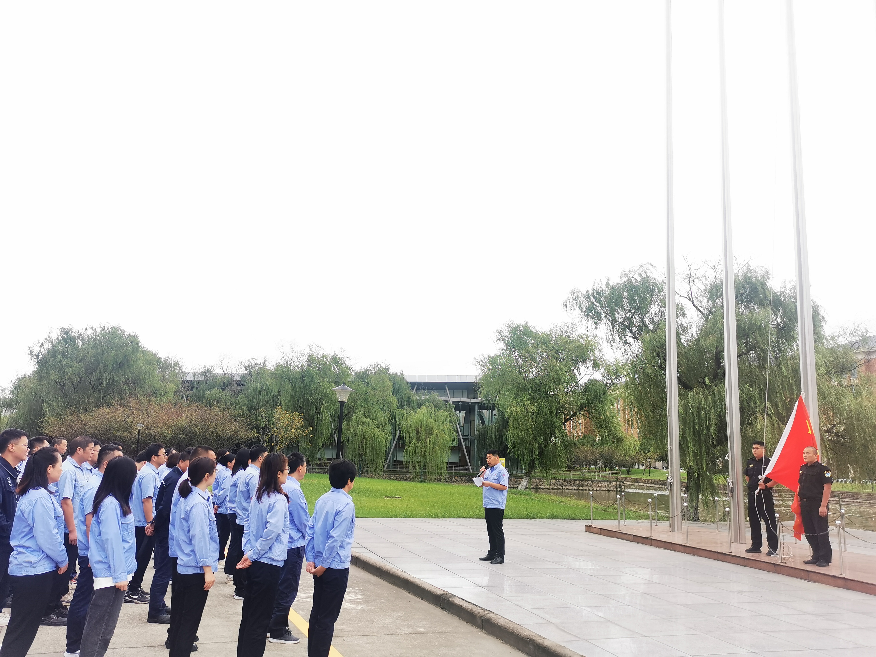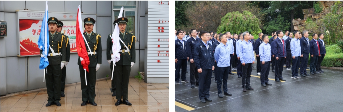上午8點,伴隨著《中國人民解放軍進行曲》,護旗手邁著整齊的步伐護送五星紅旗、航空工業司旗和寶勝股份廠旗入場。在高亢激昂的國歌、司歌聲中,三面旗幟先后升起,全場人員肅立致敬,行注目禮,表達對偉大祖國的無比崇敬和熱愛之情。